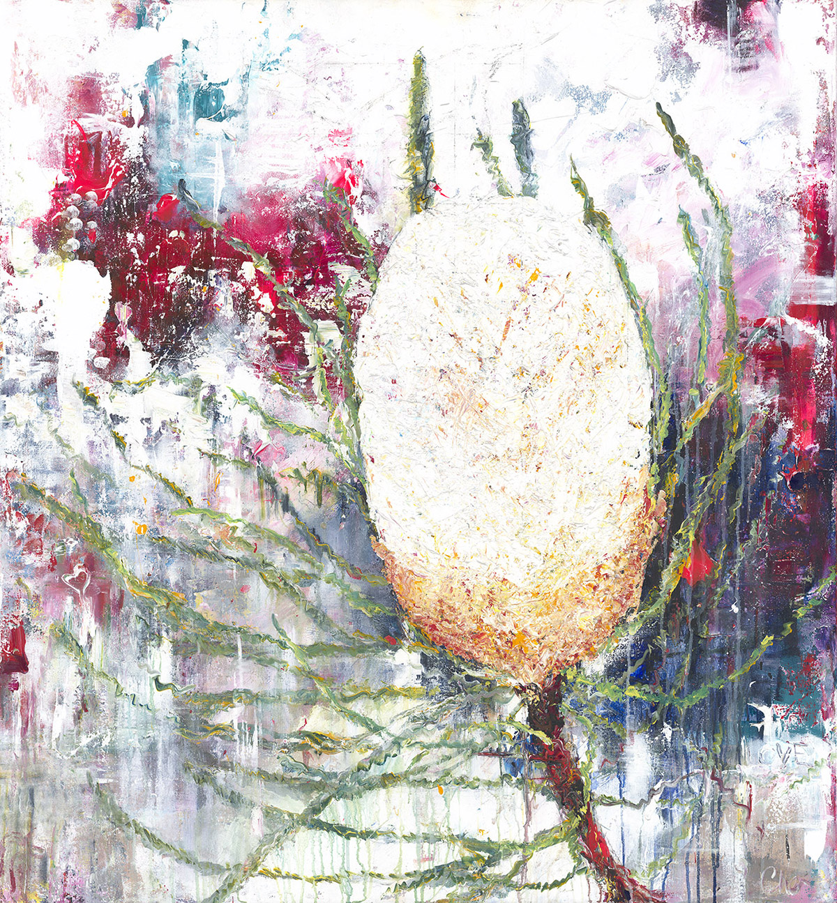 A bold, emotive celebration of the Australian native Banksia. Rendered in radiant, high-impact colour and thick impasto, the single bloom stands as a symbol of resilience and renewal.Set against a luminous wash, the work honours beauty in complexity, a conscious turning toward love over fear, chaos, or despair. This is a painting that declares itself through texture and tone, a burst of joy, defiance, and hope.